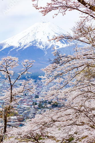 富士山と満開の桜、山梨県富士吉田市孝徳公園にて