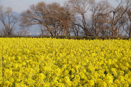 lakeshore, flower, park, field, winter, yellow, landscape, nature, plant, blue skies, spring, lake, flower garden, full bloom, sky, sunny, brassica, open air, background, green, tourist attraction