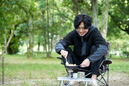 outdoors, gas cooker, gas burner, camping, stove, frying pan, table, hike, pan, alone, people, create, open air, mountain, seated, dish, japan, japanese, chair, man, climb, delicious, nature, cooking, meal, meal