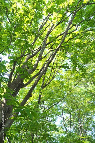 wood, branch, leaf, leaf, green, verdure, nature, green, plant, forest, grove, landscape, refreshing, air, background, light, light, branching, turning, breeding, textured, background, bg, summer, spring, sky, foliage, park, plant