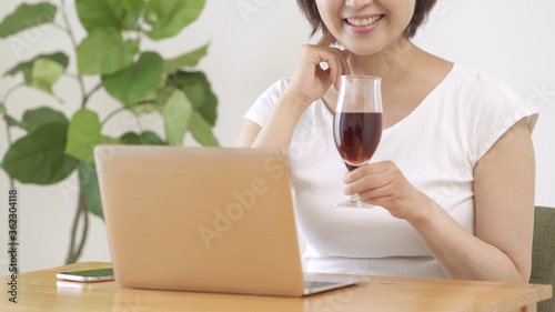 woman, portrait, japanese, asia, japan, solo, alone, people, model, young, face, clean, pretty, drinking, alcohol, fun, get drunk, drunk, alcoholism, addiction, indoor, house, room, home, personal computer, notebook, laptop, smartphone, smartphone, mobile, mobile phone, videophone, meeting, cyberspace, net, online, corona, summer, wine