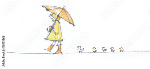 girl, raincoat, illustration, white background, umbrella, bird, children, watercolor, sweet, yellow