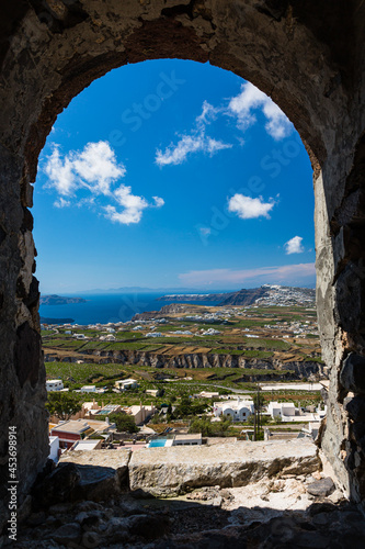 ギリシャ サントリーニ島のピルゴス村の城跡の丘から見える島全体の景色