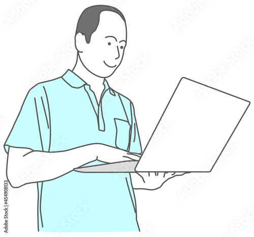 禿げた男性が、持ったノートパソコンを使っているイラスト