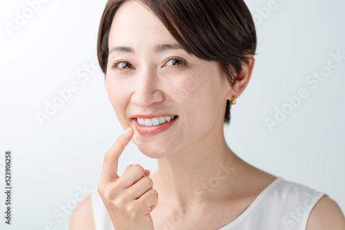 woman, girl, young, teeth, dentition, orthodontia, dental, dentist, 30s, people, mouth, middle-aged, pretty, clean, alone, smile, cary, white, white background, lovely, cosmetic, beauty, japanese, asian, up, closeup, waist up, halitosis, implant, finger, show, redress, plaque, gingivitis