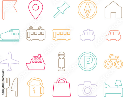 旅行交通ガイドマップ関連アイコンのセット_アウトラインカラー