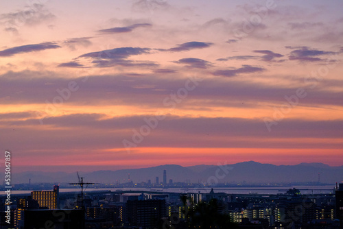 神戸市内の高台の岡本梅林公園より神戸市街地、大阪湾、背景に生駒山系を臨む。夜明け前のマジックアワー。あたりはオレンジ色に染まる