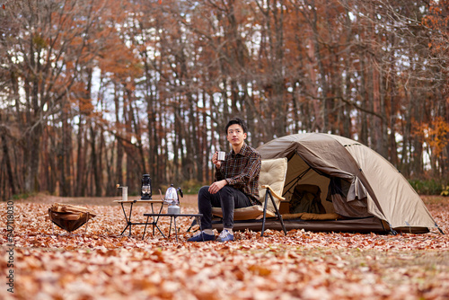 camping, people, man, outdoors, nature, japan, open air, alone, japanese, camp, relax, vacation, fun, pursuit, fall, tent, coffee, tea, mug, drink, mountain, forest, refresh, relax, vacation, relaxation, break, man, healing, daytime