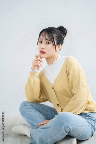 woman, young, student, jean, coiffure, make-up, beauty, model, hair, fashion, sweet, skin, studio, lady, brunette, person, smiling, smile, 1, body, face, look, teenage, familiar, home, thought, couple, floor, pose, standing, listen, glamour, fun, head, eye, enjoyment, happiness, japanese, shirt, comfortable, chair