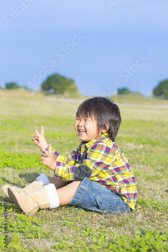 children, meadow, leisure, smile, rejoice, fine, blue skies, vacation, people, fun, boy, fall, park, play, alone, japanese, seated, open air, copy space, pretty, innocent, joyful, refreshing, lifestyle, field, toddler