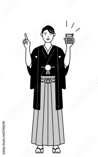 電卓を持って指さす紋付袴姿の男性