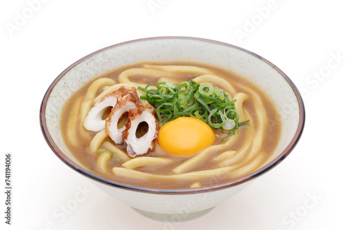 udon, food, curry, delicious, delicious, noodle, green onion, egg, yolk, japan, dinner, warm, spicey, dish, green onion, dish, bowl, up, closeup, white, white, white background, unmanned