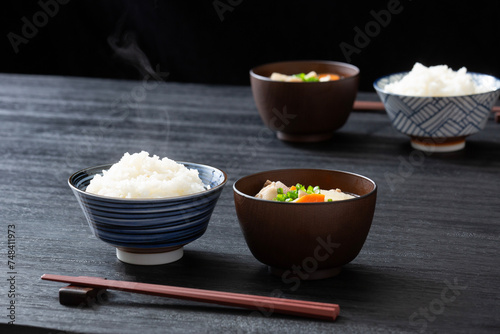 background, table, couple, two people, japanese, rice, miso soup, food, dish, meal, white rice, rice, foodstuff, black, vapour, meal, sum, table, japan, chopstick, baby animal