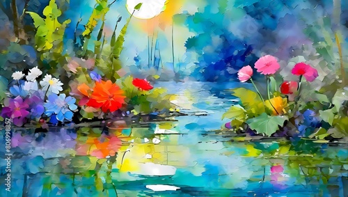 カラフルな花と水面に映る月明かり