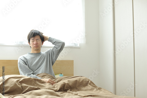 bed, sleep, man, morning, dream, stress, apprehension, live, pajama, man, asian, korean, chinese, room, house, indoor, white, window, morning sun