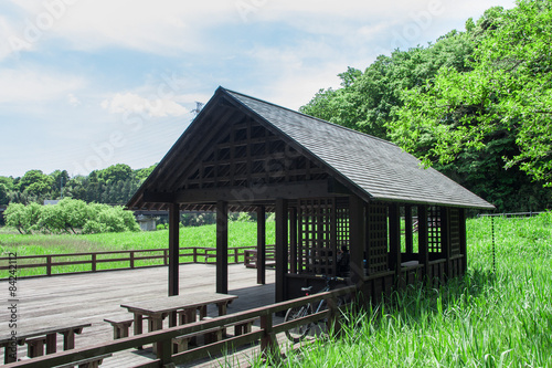 sidewalk, promenade, nature, sky, wood, green, verdure, plant, blue skies, landscape, forest, green, summer house, house, building, wetland