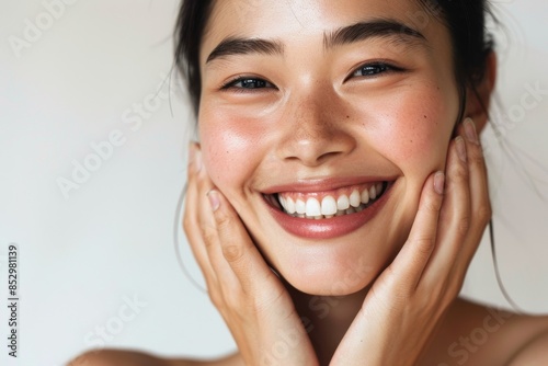 頬に手をあてる肌の綺麗な日本人メイクモデルのポートレート(美容・艶・透明感)