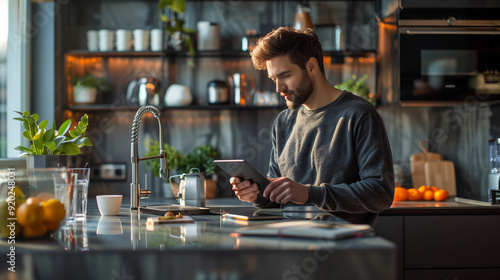 man, tablet, work, kitchen, counter, tea, cup, morning, light, digital, work, workplace, home, remote, home, lifestyle, technology, office, professional, device, home office, concentration, coffee break, note, workspace, house, home, landscape, business, smart, live, scene, casual, copy space