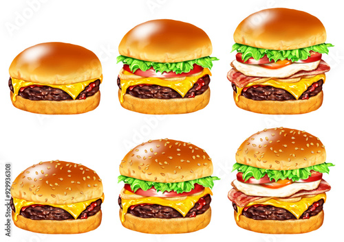 hamburger, cheeseburger, fast food, food, lettuce, patty, hamburger, mince, cheese, fried egg, egg, bacon, tomatoes, vegetable, fresh, ketchup, bread, snack, shop, take-out, delicious, junk food, saute, lunch, beef, illustration, illustration, watercolor, meal, vector, sesame, onion, dinner, bun