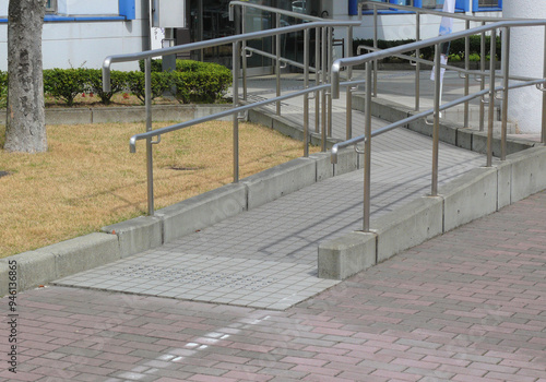 building, architecture, glasses, business, office, city, park, sky, construction, entrance, outside, design, urban, travel, grass, window, hall, front, wheelchair, ramp, welfare, safe, dangerous, guard, rail, protection, handicapped, bump, peace, building, route, street, path, public, facility, japan, asia
