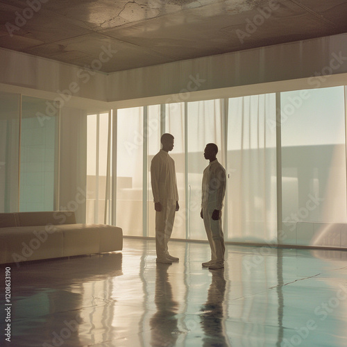 Film still, style by Her. A modern male model in a minimalist outfit, standing in a clean, futuristic apartment with large windows.