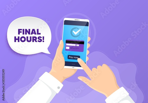 Final hours sale. Pay by card from phone. Special offer price sign. Advertising discounts symbol. Final hours chat bubble. Online payment by credit card. Hand hold smartphone. Vector