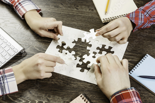 puzzle, jigsaw, concept, piece, workplace, completion, cooperation, together, find, solution, game, element, checked, shirt, casual attire, female, woman, challenge, closeup, connect, business, table, hand, wooden, put, design, incomplete, missing, part, solve, strategy, success, team, toy, work, idea, choice