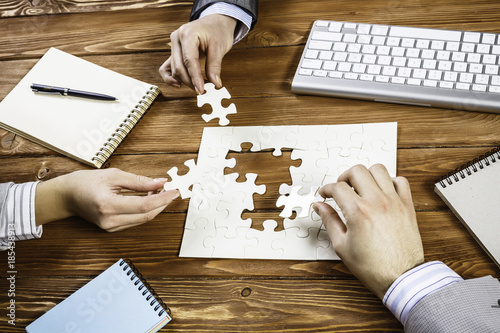 puzzle, jigsaw, concept, piece, workplace, completion, cooperation, together, find, solution, game, element, checked, shirt, casual attire, female, woman, challenge, closeup, connect, business, table, hand, wooden, put, design, incomplete, missing, part, solve, strategy, success, team, toy, work, idea, choice
