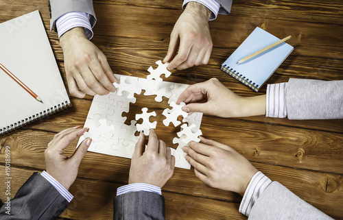 puzzle, jigsaw, concept, piece, workplace, completion, cooperation, together, find, solution, game, element, checked, shirt, casual attire, female, woman, challenge, closeup, connect, business, table, hand, wooden, put, design, incomplete, missing, part, solve, strategy, success, team, toy, work, idea, choice