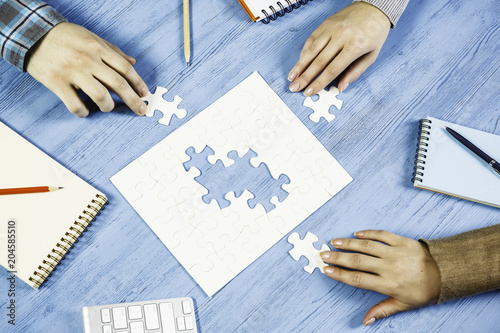 business, find, solution, teamwork, together, casual attire, concept, people, team, woman, blue, female, jigsaw, connect, piece, table, workplace, game, strategy, help, support, puzzle, suit, cooperation, connection, idea, success, partnership, part, thinking, group, top, view, communication, join, man