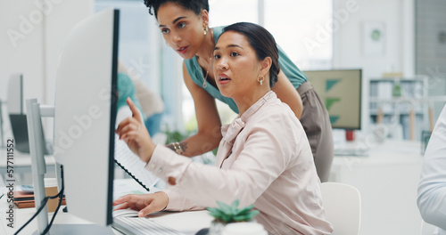 Finance, documents and collaboration with a business black woman talking to a colleague in the office. Teamwork, planning and strategy with a graph or chart on a computer screen at work
