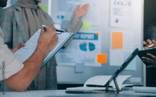 Finance manager meeting discussing company growth project success financial statistics, professional investor working start up project for strategy plan with document, laptop and digital tablet.