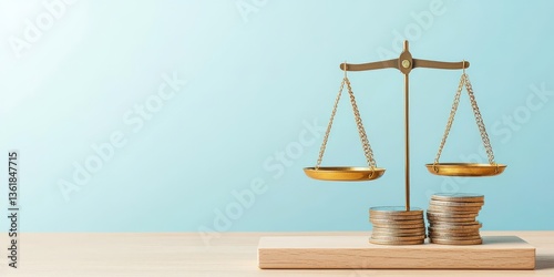 financial benefits budget optimization concept. Balance scale with coins representing finance and justice concepts.