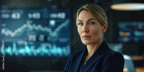 caucasian, female, middle-aged, contemplative, businesswoman, leadership, confidence, professional, suit, dark blue, modern, sleek, office, digital, chart, facial, expression, depth, field, effect, lighting, sharp, detail, screen, glow, contemporary, design, corporate, executive, woman, indoor, technology, analysis, strategic, pensive, concentrated, finance, thoughtful, success