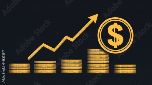 Financial growth illustration symbolizing profit increase with rising arrow and stacked golden coins on a dark gradient background