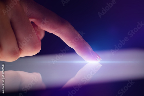 Finger touching tablet with dark background with copyspace