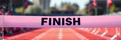Finish line banner at a sports event, signaling achievement and determination, with vibrant red track and blurred crowd in the background