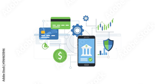 Fintech Ecosystem Illustration: Secure Mobile Banking, Online Payments, Investment Data, and Digital Financial Transactions.