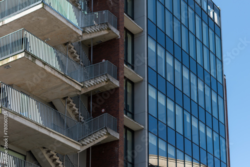 Fire escape of buildings in the city,building with external stairs,building with outside stairs,glass windows and stairs