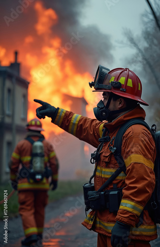 Firefighters in orange uniform with helmets, gas mask stand near burning building. One fireman points to fire another walks away from flames with hose. Fire brigade fights blaze in residential area.