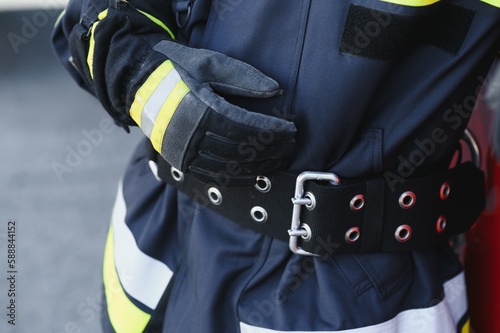 Fireman (firefighter) in action standing near a firetruck. Emergency safety. Protection, rescue from danger.