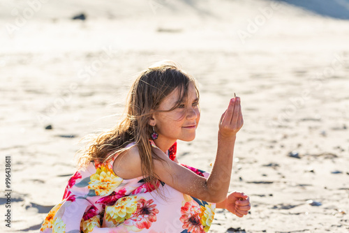 First Nations Australian Torres Strait Islander girl playing in the sand on windy day at the beach