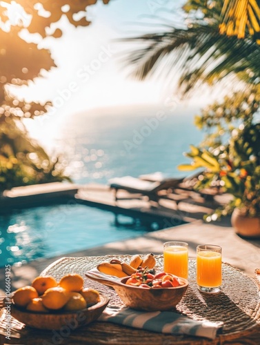 view, villa, terrace, ocean, midday, sun, table, foreground, goggles, juice, exotic, fruit, vibrant, atmosphere, pool, background, luxury, relaxed, ambience, tropical, get-away, elegant, greenery, sunny, bright, chic, high-end, travel, escape, open air, scenery, paradise, premium, lush, inviting, refreshing, holiday, scenic, relaxation, peaceful, summer, leisure, photorealistic, sunlight
