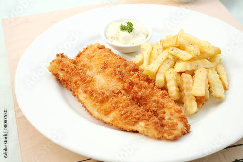 Fish and chips on white dish.
