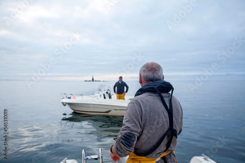 Fisherman on motorboat talking with man,†Kerroch, Brittany, France