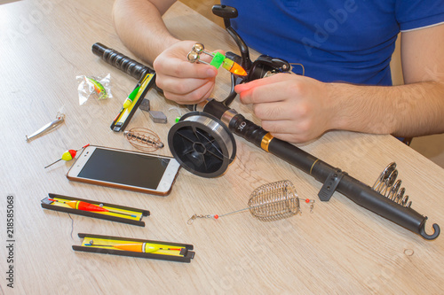 Fisherman prepare to fishing. Tools and accessories on wooden table