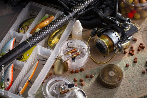 fishing tackle on a wooden table. toned image