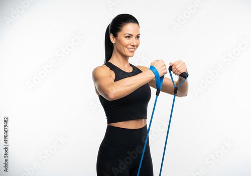 Fit young woman demonstrating a strength training exercise with a blue resistance band in a studio