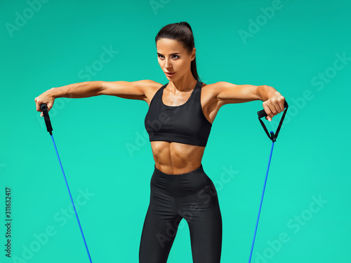 Fitness girl performs exercises with resistance band. Photo of fitness model workout on turquoise background. Strength and motivation