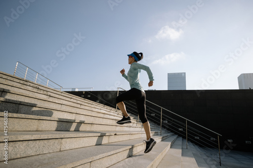 Fitness sports woman running up stairs in city
